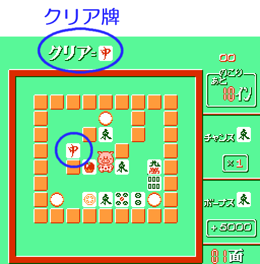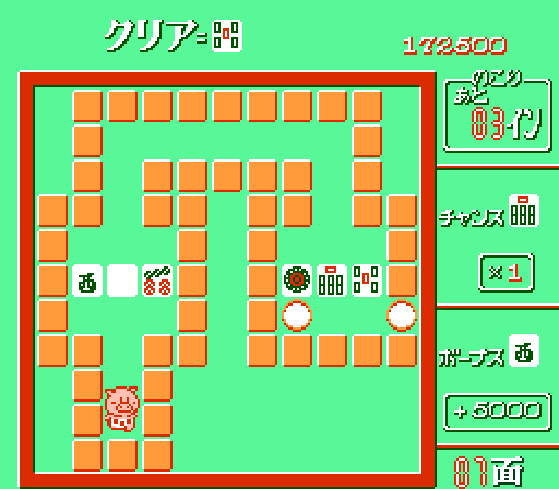 フィールドの上部に表示されているのがクリア牌よ。 牌の動かし方は2種類あって、Bボタンを押すと『プッシュ』で牌を1マス分、 Aボタンを押すと『パンチ』で複数まとめて壁にぶつかるまで押すことができるわ。