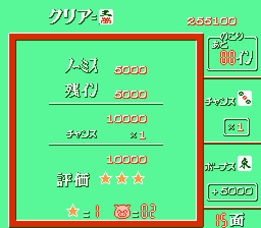 面クリア時にクリア方法に応じて★の数で1〜5段階の評価がなされるわ。 評価の目安として高いスコアを得ることは大事なのよ。