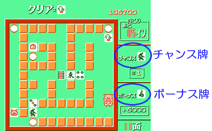 次はチャンス牌とボーナス牌の説明をするね。 チャンス牌は各面ごとに設定された普通牌で、落とすと5000点もらえる牌だよ。