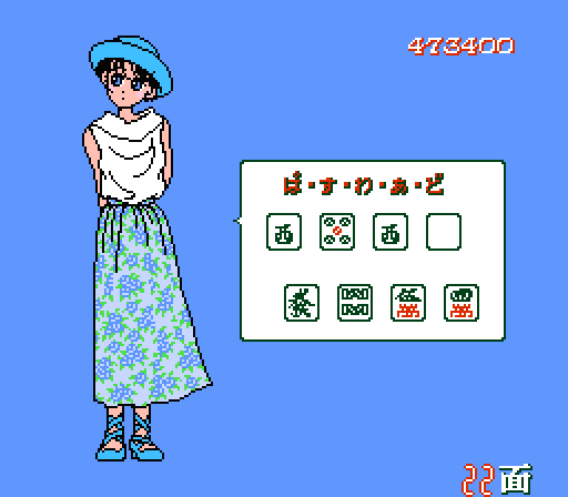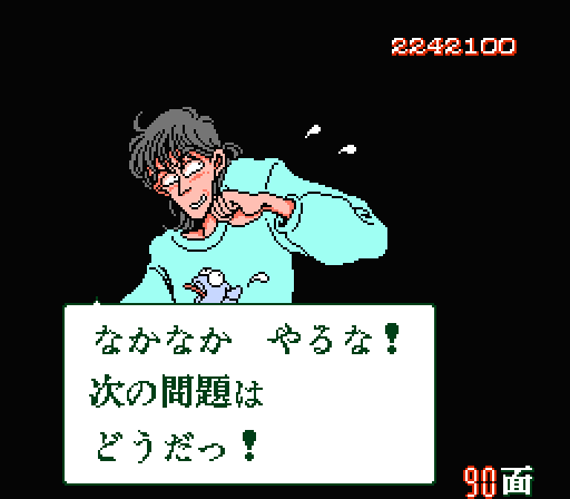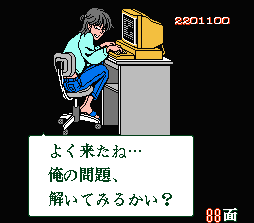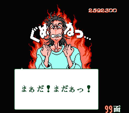 ここからは最終ステージの99面までずっとこの人との勝負になるよ。 パスワードも教えてくれないから、一気にクリアまでの長丁場を駆け抜けないといけないんだ。